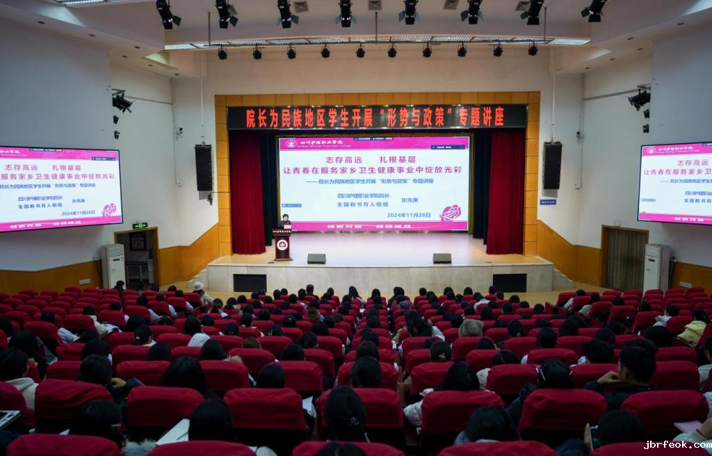 讲座中,张先庚结合党的二十届三中全会、省委十二届六次全会、全国教育大会、四川省教育大会及四川省卫生健康大会精神和国家、省卫生健康相关政策以及医药卫生专业和学生情况,围绕加快发展新质生产力,深化医药卫生体制改革,推进卫生健康现代化和卫生健康事业高质量发展,用翔实的数据和案例,从四川民族地区医疗卫生事业现状、学院对民族地区的对口帮扶、医药卫生事业未来发展趋势及新时代大学生责任担当四个方面,让同学们深刻感受到了党和国家对他们的关心关爱,帮助学生明确了努力方向,坚定了学习医药卫生专业的自信。她勉励同学们要珍惜在校学习机会,成为“感恩—奋斗—担当”的新时代大学生,爱党、爱国、爱校、爱家、爱专业,学好知识,练好本领,扎根基层,回到家乡、服务家乡、建设家乡,成为“情怀深、技术精、善创新、有大爱 讲奉献”的医药卫生人才,助推健康中国、健康四川战略。