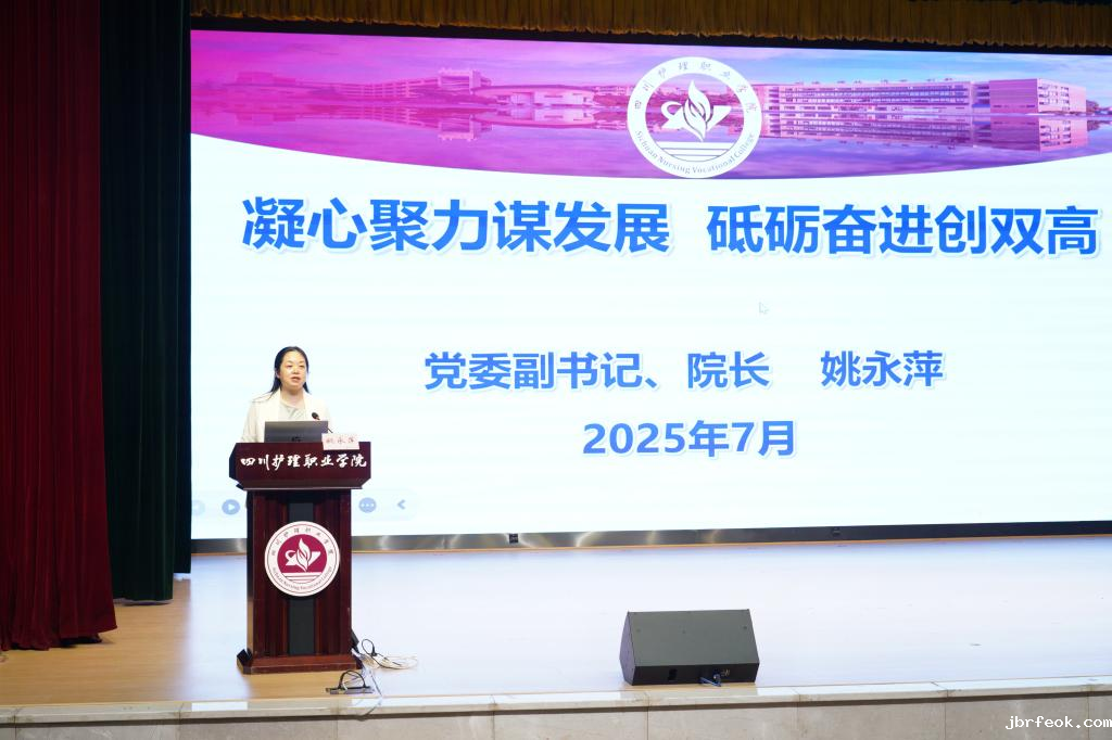 会上,院长姚永萍教授作题为《凝心聚力谋发展 砥砺奋进创双高》专题报告,她从“新双高”实施背景开篇,指出学院内涵建设存在的问题,明确下一步建设思路及规划展望。要求全院教职工要凝心聚力,聚焦“作风建设”,立规矩、强担当、提效能,实现“双高建设”目标;要对标对表、凝聚力量、决战决胜,攻坚“双高建设”关键期;要固本培元、守正创新、追求卓越,深化“内涵建设”,争创高水平标志性成果。