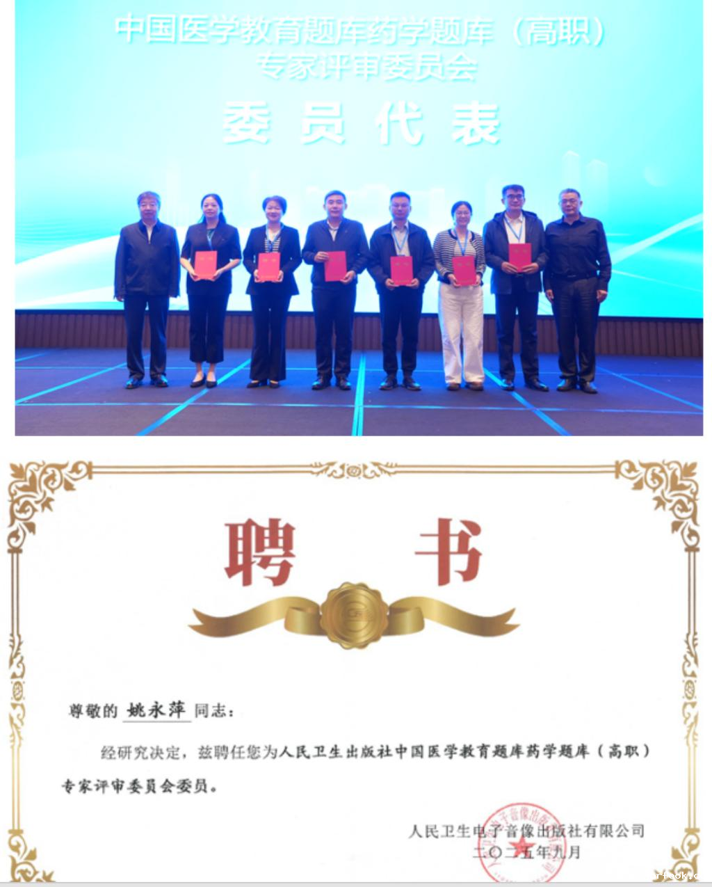 为贯彻落实教育部2025年修订的高等职业教育专科药学专业教学标准,深化教育教学评价改革,9月27日,由人民卫生电子音像出版社、全国卫生健康职业教育教学指导委员会药学类专业委员会联合主办的“中国医学教育题库药学题库(高职)主编人会议”在兰州召开。会议汇聚全国28所药学职业院校专家,旨在构建科学化、标准化的教育评价新模式。学院党委副书记、院长姚永萍教授作为专家评审委员会委员及《临床药物治疗学》课程题库主编受邀出席,并获颁聘书。