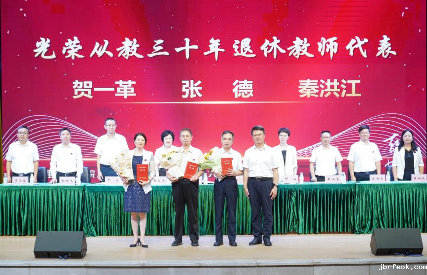 张先庚为从教30年在职教师代表颁发证书并献上鲜花