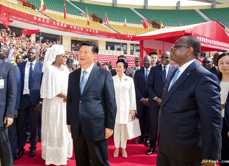 2018年7月22日,国家主席习近平在达喀尔同塞内加尔总统萨勒共同出席塞内加尔竞技摔跤场项目移交仪式。新华社记者 王晔/摄