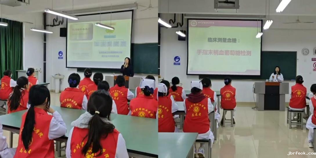 在技能培训环节,谯邦兴副教授系统讲解了血压、血糖测量的规范操作流程与注意事项,演示了仪器使用步骤、数据记录要点以及在社区服务中的沟通技巧,并分组开展实操训练。