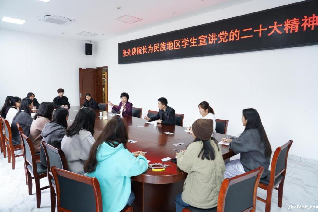在民族地区学生代表座谈交流会上,她指出,民族地区基层最需要人、大有可为、大有作为,鼓励同学们作为未来国家卫生健康事业的生力军,要珍惜在校学习机会,传承川护大爱,爱党、爱国、爱家、爱校、爱专业,树立“自己的家乡自己建设”的理念,争做感党恩、有大爱、专业精、能创新、讲奉献的“感爱专创献”民族医药卫生全科人才,报效国家、回报家乡,努力成为民族地区农牧民的健康守护人。在与学生干部、青马班和优秀学生代表座谈交流,张先庚院长引导青年学生践行党的二十大精神,争做新时代职教生。勉励同学们志存高远、敢于有梦、勇于追梦、勤于圆梦,用奋斗建功新时代,把自己培育成德智体美劳全面发展的新时代高素质卫生健康技能人才!