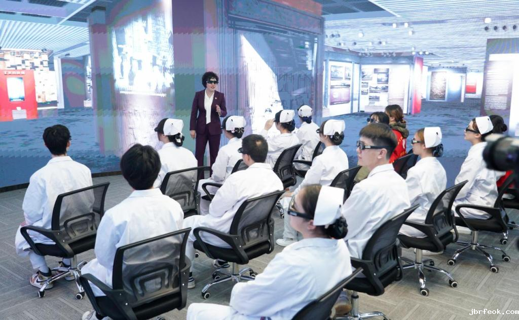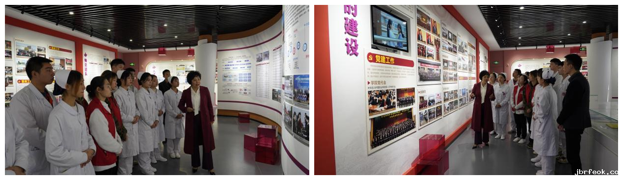 在学校360度全沉浸式党建思政馆,张院长为同学们讲解了我国医药卫生事业的发展历程,引导青年学生以学习贯彻党的二十大精神的实际行动,把青春‘小我’融入时代‘大我’,为时代增光添彩,为祖国医药卫生事业贡献力量。
