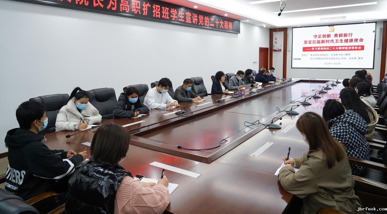 为深入学习贯彻党的二十大精神,培养学生爱党爱国情怀,11月30日,教育部全国高校学习宣传党的二十大精神师生巡讲团成员、学院党委副书记、院长张先庚教授以《守正创新 勇毅前行 坚定扛起新时代卫生健康使命》为题,通过线上线下方式,为300余名高职扩招班学生宣讲党的二十大精神。