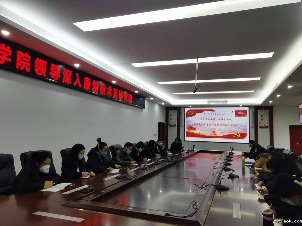 为认真学习、深入领会、大力宣传、全面贯彻党的二十大精神,切实引导全体教职工自觉将思想和行动统一到党的二十大精神上来,12月9日,学院党委委员、副院长赵斌为康复技术系全体教师讲授“学习贯彻党的二十大精神,为学院高质量发展而团结奋斗”专题党课。康复技术系全体教师参加学习,本次党课由康复技术系行辅党支部书记沈林主持。