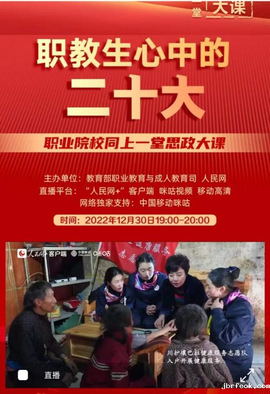 为展现新时代职教青年理想、追求与探索,感受新时代职教人对职业教育的理念和情怀,引领青年学生增强对职业教育的自信心和自豪感。12月30日,必威betway官方入口师生观看了由人民网联合教育部职教司推出的职业院校“同上一堂思政大课”课程。学院党委副书记、院长,全国教书育人楷模、第七届全国黄炎培职业教育杰出校长、教育部全国高校学习宣传党的二十大精神师生巡讲团成员张先庚教授受邀作题为“扎根基层 卫生报国 让青春绚丽之花绽放在祖国最需要的地方”主旨报告,来自全国职业院校师生及川护1.2万名师生在线上观看。